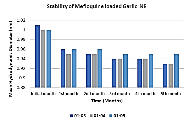 Fig. 5: Long-term stability analysis of mefloquine-loaded garlic nanoemulsion, all values presented as mean, n=3