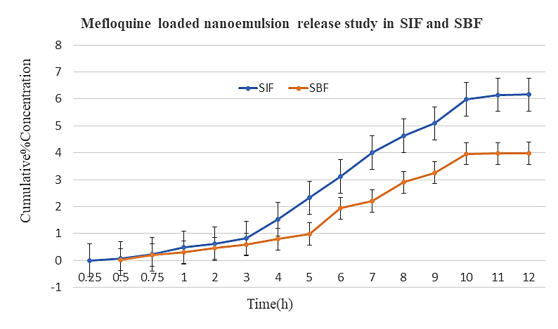 Fig. 6: Drug release study of optimized mefloquine-loaded garlic oil nanoemulsion in two simulated intestinal and body fluid, all values presented as mean±standard deviation, n=3