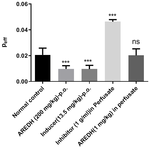 Fig. 1: Effect of AREDH on intestinal permeability of fexofenadine, all the values were expressed as mean±SEM n=6. *p<0.001, ***statistically significant difference in the AREDH group when compared to normal control. *p<0.001, ***statistically significant difference in inducer group when compared to normal control. *p<0.001, ***statistically significant difference in the inhibitor group when compared to normal control. ns no significant difference in AREDH in perfusate when compared to normal control