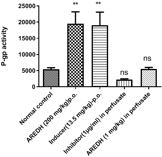 Fig. 2: Estimation of P-gp activity in different groups, all the values were expressed as mean±SEM n=6 *p<0.01, ** statistically significant difference in the AREDH group when compared to normal control. *p<0.01, ** statistically significant difference in inducer when compared to normal control. ns no significant difference in inhibitor and AREDH in perfusate when compared to normal control