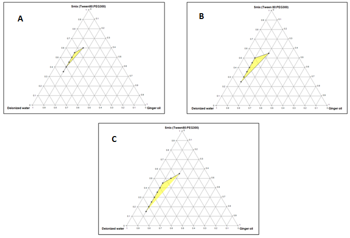 The components that were included in the plotting of the pseudo-ternary phase diagram were oil, double distilled water, and Smix. Smix was presented in different weight ratios, such as 1:1, 2:1, and 3:1 (fig. 2). The colored region in the plot represents the region of nanoemulsion, and the larger colored region indicates a good nanoemulsifying activity [16].