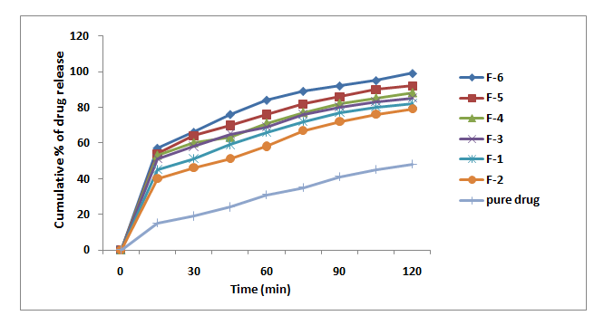 The in vitro release of cilostazol nanoemulsions (F-1, F-6) and of the pure drug was made by dialysis bag technique in dissolution medium phosphate buffer (pH 6.8) for two hours. The result of cilostazol release from nanoemulsions and the pure drug was in the following order; F-6>F-5>F-4>F-3>F-1>F-2>pure drug (fig. 3). There was a significant difference (P<0.05) between the release of the drug and time. The release of the drug in the dissolution medium reflects the effect of the concentration of surfactant. It means that as the concentration of tween 80 increases, the release of the drug from the formula will increase up to a certain concentration [23]. Therefore, in a high concentration of surfactant, the drug diffuses from the dialysis bag to the dissolution medium, leading to a lower release of the drug [25]. This has been noticed in a lower release of cilostazol from the nanoemulsion formula with S mix (1:1), and a higher release from the nanoemulsion formula with S mix (1:3).