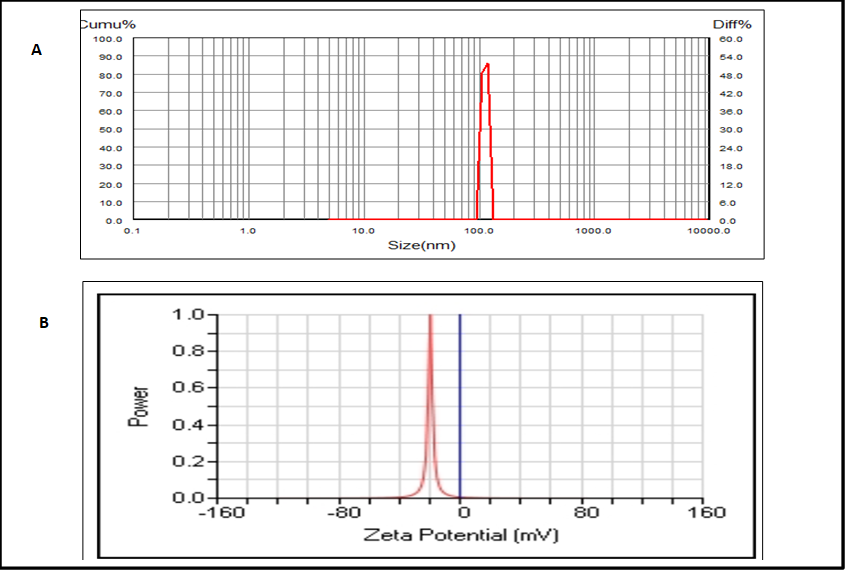 Fig. 4: Droplet size (A) and zeta potential (B) of formula 6 (F-6)