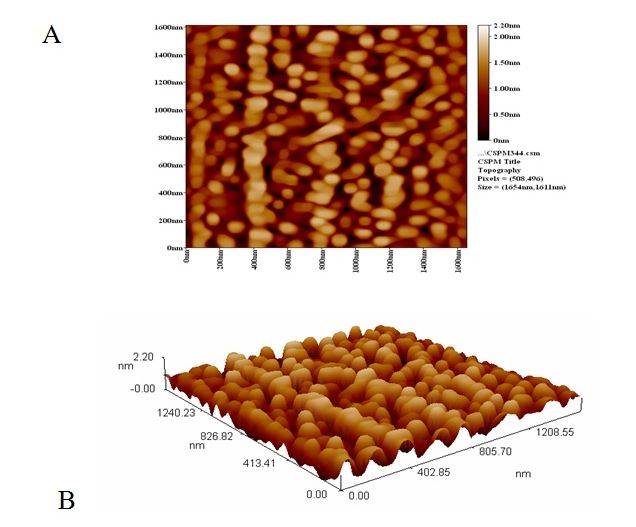 Fig. 5: SPM image of cilostazol nanoemulsion (F-6), A is a 2D image and B is a 3D image