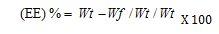 Absorbance of the selected Nanovesicle dispersion was measured and detected at 294 nm using UV spectrophotometer by centrifuging it at 15,000 rpm for 10-25 min. The supernatant liquid thus separated was then transferred to a 10 ml volumetric flask; required dilutions were made followed by filtration. Following the formula, the percentage of drug encapsulation efficiency was determined.