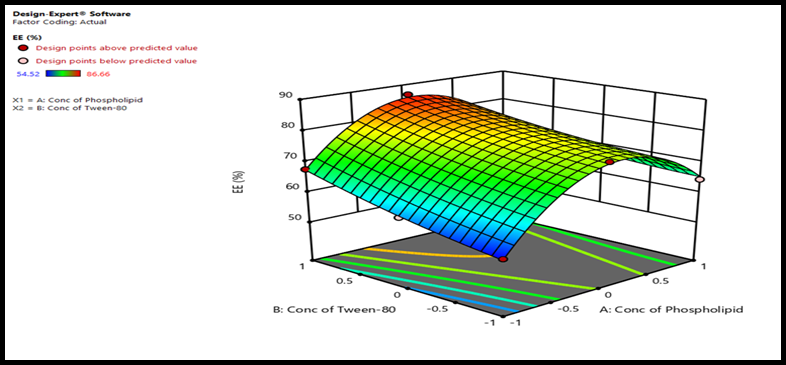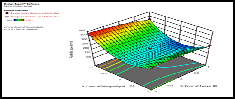 The concentration of Drug: Phospholipid ratios (X1) and Concentration of Tween-80 (X2) were clearly the main contributing variables during the manufacture of transfersomes, according to the model analysis.