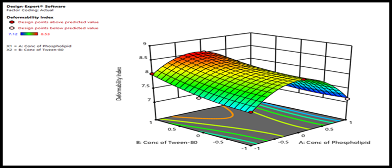 The negative X1 and X2 coefficients indicate that the vesicle size was decreased by increasing the concentration of phospholipid and edge activator. Phospholipid is responsible for creating the lipid bilayer structure in vesicles. In an aquatic environment, phospholipid organizes into the lipid bilayer and seals off to create a spherical vesicle. Additionally surfactant makes lipid bilayers in vesicles more flexible, which causes them to be more deformable. Surfactants increase the vesicle's deformability and the drug's ability to penetrate mucosal membranes and eventually enter the systemic circulation.