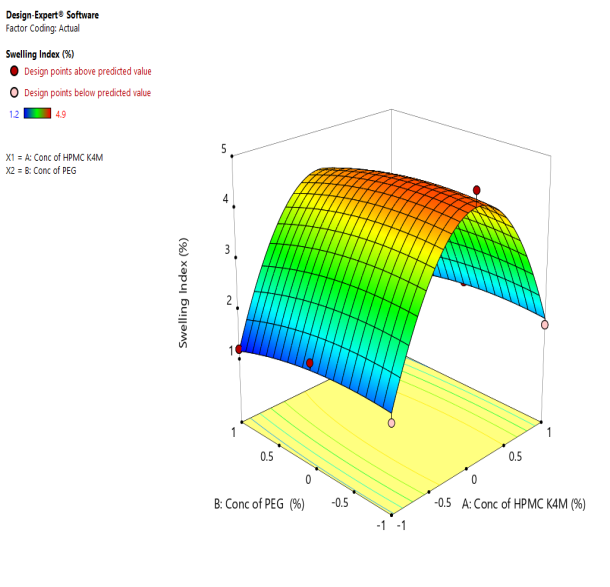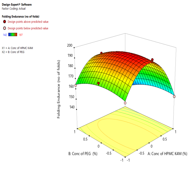According to the quadratic models and polynomial equations created by the CCD swelling time and folding endurance of SL films were found to have positive and negative effects, respectively. When HPMC concentration was increased from 2.5 to 3.5%, swelling time was found to be increased, but only up to a certain concentration which may be due to the increased viscosity of HPMC causing the film swelling to be delayed thus decreasing the HPMC films ability to swell.