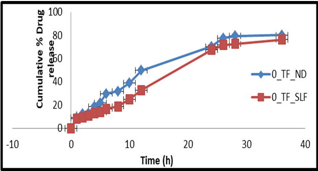 Franz diffusion cells comprising donor and receiving (receptor) compartment were. Selected nanodispersions were measured out and placed in the donor compartment. To maintain a constant volume, the required amount (5 ml) of the solution from the receiver compartment was removed at preset scheduled intervals and swapped with the equal volume of the dissolving media in the flask. The pipetted samples were filtered diluted appropriately and drug absorbance was measured at 294 using a UV-visible spectrophotometer. To preserve accuracy and precision, the readings were made in triplicate [30].