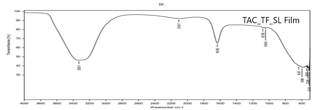 It can be determined that there are no specific interactions between the excipients and the drug from the FT-IR spectra of the pure drug, the ATR-FTIR spectra of the optimized TAC-loaded transfersomal sublingual film and the physical mixture. The drug remains intact in the formulation without interacting, as evidenced by the presence of the drug's distinctive peaks in both the physical mixture and the formulation [40].