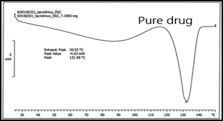 The drug peak was less intense but did not move significantly in the optimized sublingual film. The observed results very well corresponded with DSC tests conducted on tacrolimus PLGA Nanoparticles by Ajinath E. Shirasat et al., indicating that the drug is merely physically entrapped in the polymer matrix and there is no interaction between drug and polymers [41].