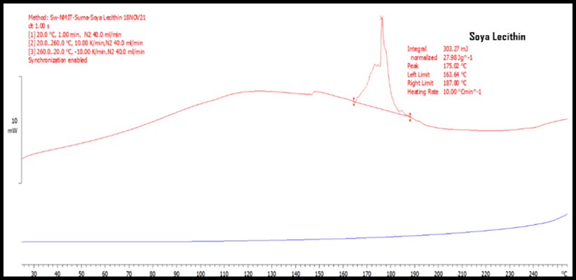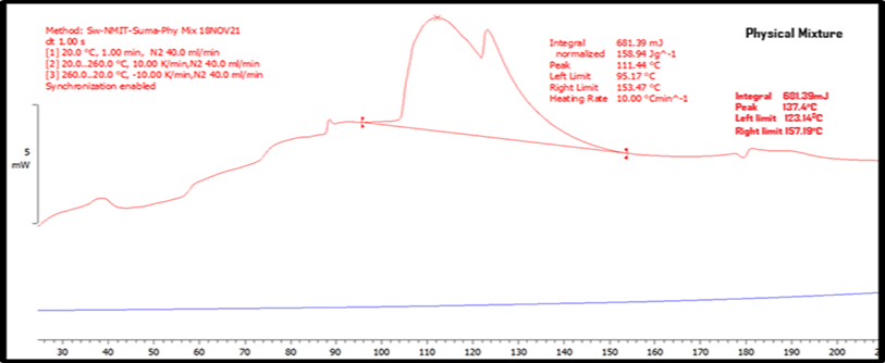 Tacrolimus was used as a pure drug in the current work, and DSC studies were used to examine the thermal behaviour of polymers (HPMC), phospholipid (soya lecithin), and drug-loaded optimized nanovesicular sublingual film O_TAC_TF_SLF. Tacrolimus DSC thermogram showed a clear endothermic peak at 131.8 °C. Soy lecithin and the polymer HPMC both have melting points of 78.5 °C and 175.28 °C, respectively.