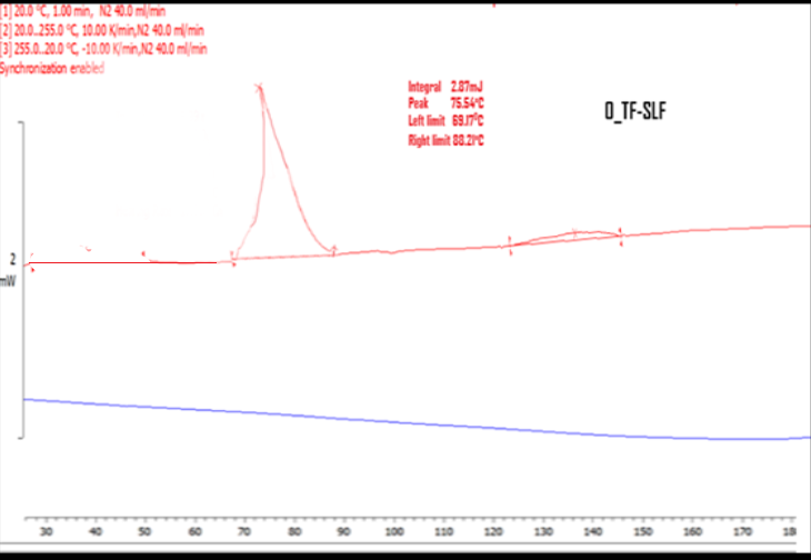 The melting peaks of the pure drug and HPMC are visible in optimized formulation O_TAC_TF_SLF, but the pure drug peak was only moderately intense, which may be related to the drug being trapped in an amorphous state and forming a new phase due to its reduced structure in the lipid bilayer structures.