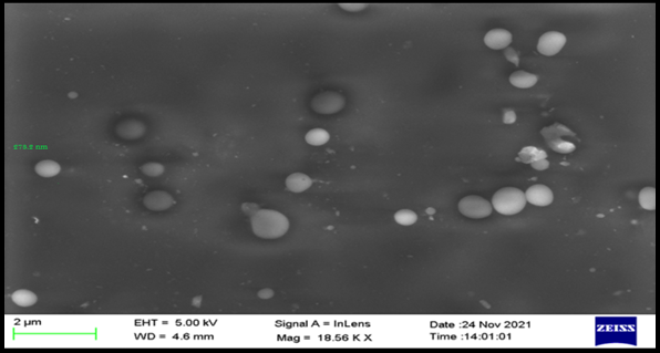 Even textured globular vesicles with high dispersibility and no discernible mass were observed for the chosen and improved nanovesicular rapid dissolving sublingual film O_TAC_TF_SLF, indicating the intactness of the optimized film without any appreciable changes in morphology, shape, or dispersibility.