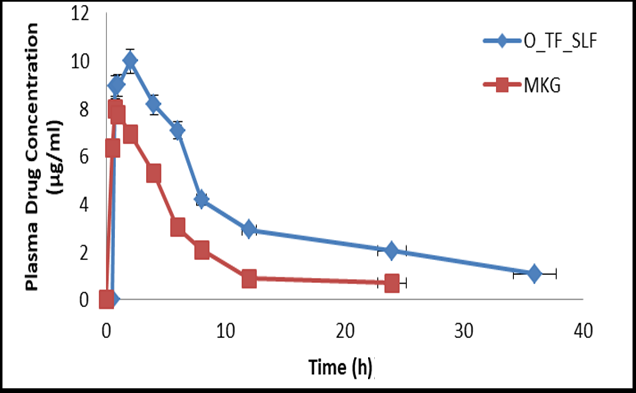 It was shown that tacrolimus administered as sublingual films through the sublingual route displayed regulated and sustained release with higher plasma concentration as compared to oral marketed dosage form. TAC loaded Transfersomal sublingual film shown a notable increase in plasma concentration of 9.16±2.34µg/ml at Tmax of 1.51 h, when compared to marketed dosage form of 7.99±1.23 µg/ml at Tmax of 0.75±1.78 h respectively.