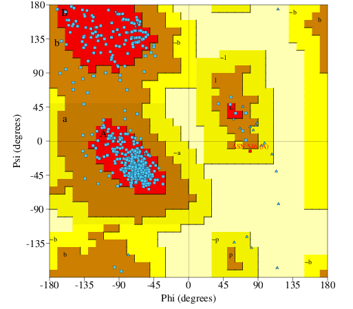 The Ramachandran plot revealed that the ACE2 protein has 491 residues in the most favored region, 44 residues in additionally allowed regions, one residue in the generously allowed region, and no residues in the disallowed region. The purified structure of ACE2 has 32 glycine and 27 proline residues. Whereas, the 3CLpro protein has 193 residues in the most favored region, 33 residues in additionally allowed regions, two residues in the generously allowed region, and no residues in the disallowed region. The purified structure of 3CLpro has 35 glycine and 5 proline residues (fig. 2).