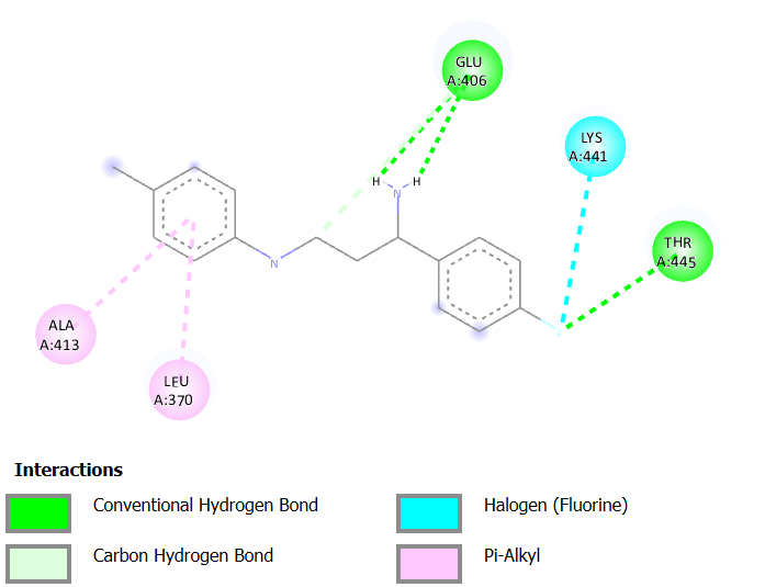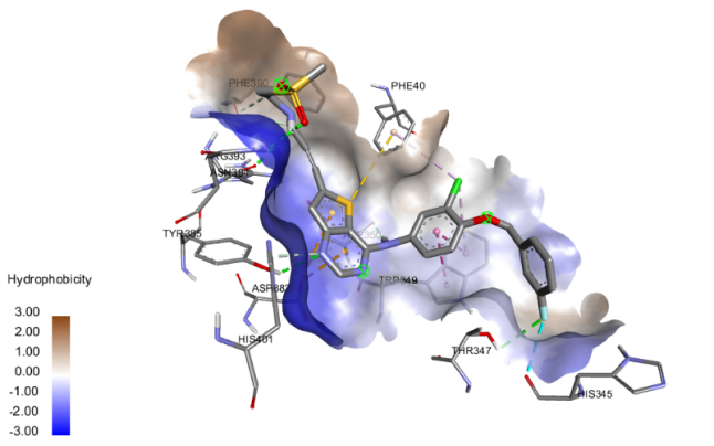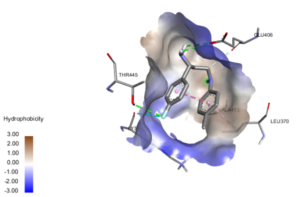 The docking interactions were analyzed to ascertain the dominant interactions in the binding pocket of the protein. The hydrophobicity of the protein binding pocket is vital in determining the protein topology and stability as it helps to eliminate unwanted interactions with the non-structural water molecules. Good hydrophobicity was observed on the protein surface. It was noticed that the ligand 10038137 was interacting with GLU 406 and THR 445 by establishing hydrogen bonds (fig. 3). While the ligand 10036216 was majorly interacting with GLN 442 and THR 445 by establishing hydrogen bonds in the binding pocket of the protein (fig. 4). Similarly, the ligand 10061134 has established five hydrogen bonds with amino acids THRC347, ASP 350, TYR 385, ARG 393, and ASN 394 respectively (fig. 5).