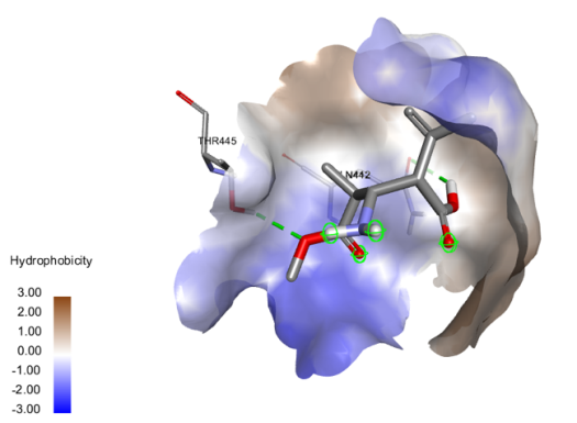 | 10036216 | -16.3 | GLN A: 442, THR A: 445 | THR A: 445, ASP A: 132 | THR A: 445 |