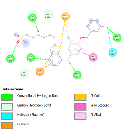 The Omicron virus predominantly affects the respiratory system and provokes ARDS. The most apparent aspect of ARDS is the cytokine storm that advances with the release of cytokines. The pernicious immune response induces ARDS, pulmonary collapse, and organ damage that affects the hepatic, cardiac kidney, and central nervous system, which ultimately culminates in death. Cellular kinases can participate in the different phases of the virus's life cycle and therefore, the kinase has been proposed as potential moderators of various viral infections [20, 47]. Numerous kinases are involved in the development of CoVD-related complications, including asthma, inflammation, and fibrosis. To combat pulmonary viral infections, kinase inhibitors deploy immediate antiviral effects as well as anti-inflammatory, cytokine-suppressive, and anti-fibrotic properties, which are beneficial in the management of CoVD symptoms [48, 49]. In the present study, the compound, with PubChem CID: 10218299, (N-[3-chloro-4-[(3-fluorophenyl)methoxy]phenyl]-6-[3-(2-methylsulfonylethylamino)prop-1-ynyl]thieno[3,2-d]pyrimidin-4-amine) is a thienopyrimidine compound which is a tyrosine kinase inhibitor and therefore, it can be hypothesized that this compound may be beneficial in managing the detrimental CoVD symptoms accelerated due to the cytokine release.