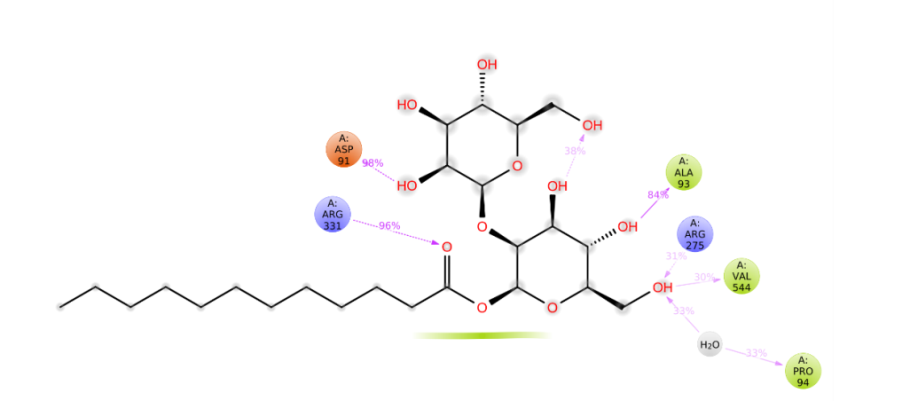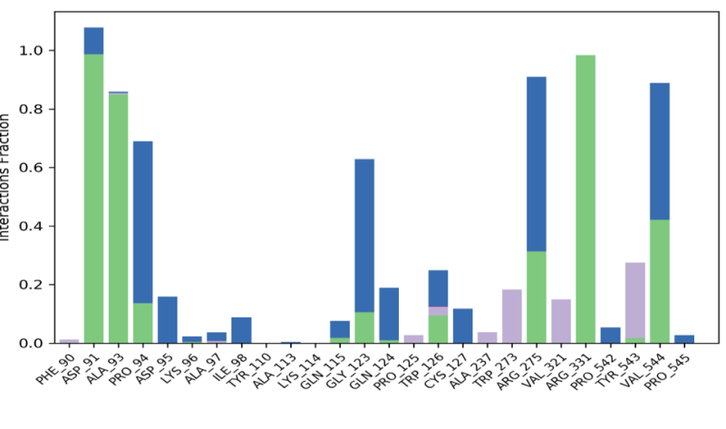 Fig. 7: Protein-ligand contacts, ASP_91, ALA_93, ARG_331, ARG_275, and VAL_544 showed the highest contact with H-bonds (Green), Hydrophobic interactions (purple), and water bridges (Dark blue)