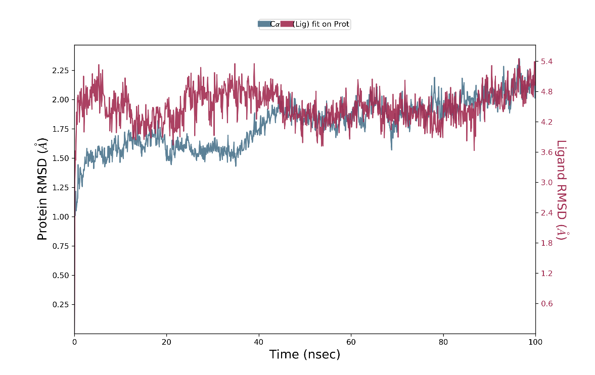 The Protein RMSD graph provides information on the structural conformation of the protein throughout the simulation, while the ligand RMSD represents the stability of the ligand with respect to the protein and its binding pocket (fig. 8). The ligand RMSD values are significantly lower than the protein RMSD values, and these values indicate that the ligand has not diffused away from its initial binding site.