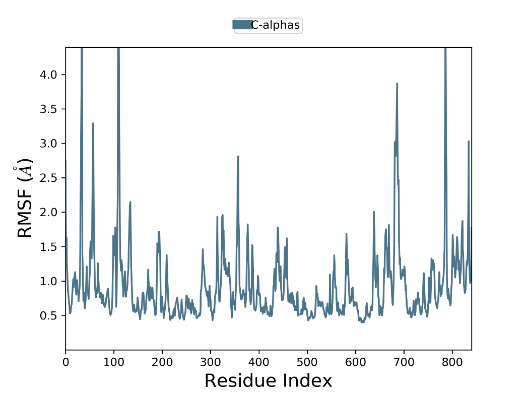 Fig. 9: Protein RMSF, the peaks in the graphs indicate the area of the protein that fluctuates most during simulation. The N-and C-terminal fluctuate the highest whereas the secondary structures fluctuate the least