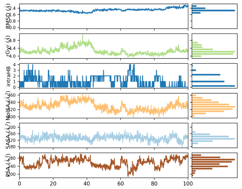 Six parameters are employed to evaluate the properties of the ligand (fig. 10). The PSA (Polar Surface Area) analyzes the solvent-accessible area in a molecule contributed by Oxygen and nitrogen atoms. While the SASA (Solvent Accessible Surface Area) estimates the surface area of a molecule accessible by a water molecule. The MolSA (Molecular Surface Area) is equivalent to van der Waals's surface area. The radius of gyration (rGyr) is the measure of ligand extendedness and the ligand RMSD is the measure of the deviation of the ligand with respect to the reference conformation. Intramolecular Hydrogen Bonds (intraHB) represent the number of internal hydrogen bonds within a ligand molecule.