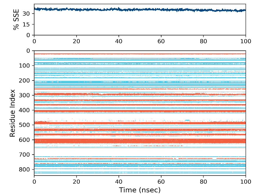 Protein secondary structures like alpha-helices and beta-strands are monitored throughout the simulation. The plot %SSE summarizes the SSE composition for each trajectory frame throughout the simulation, and the plot at the bottom monitors each residue and its SSE assignment over time (fig. 11).