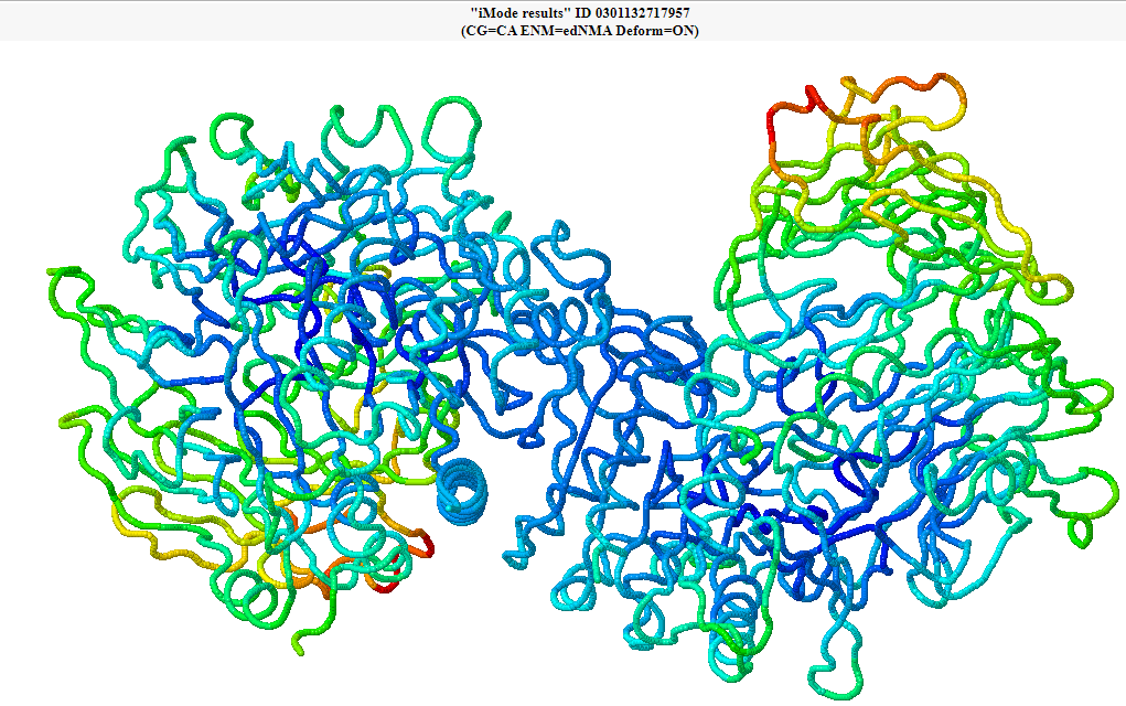 Normal Mode Analysis (NMA) is a computer-based simulation approach for evaluating the movement patterns of atoms or molecules [40]. The NMA in this research was performed using the iMODS server (https://imods.iqfr.csic.es/). The iMODS server aids in the exploration of macromolecule functioning and generates readily accessible data on pathways that may be linked to the macromolecule in question or homologous structures.