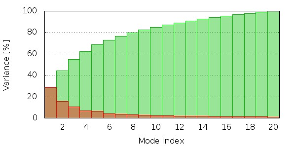Fig. 16: Variance associated with normal mode, in the graph, the colored bars in red represent the individual variances and the green bars represent the cumulative variances