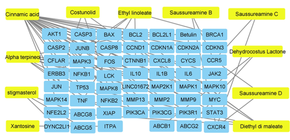 Currently, Qusthul Hindi has been widely used to treat various diseases for its anti-ulcer, anticonvulsant, anticancer, hepatoprotective, anti-inflammatory, anti-arthritic, and antiviral activities. Phytochemical analysis of Qusthul Hindi reveals a diverse range of metabolites, such as sesquiterpenes, flavonoids, phytosterols, lignans, and terpenes. Among the sesquiterpenes, dehydrocostus lactone, dihydrocostunolide, costunolide, and lappadilactone have been isolated as the main chemical constituents. Sesquiterpenes and flavonoids are the main active constituents responsible for various pharmacological activities [8, 9]. Additionally, other glycoside compounds have been identified, including chlorogenic acid, β-costic acid, daucosterol, β-sitosterol, and saussureamines A-E [10].