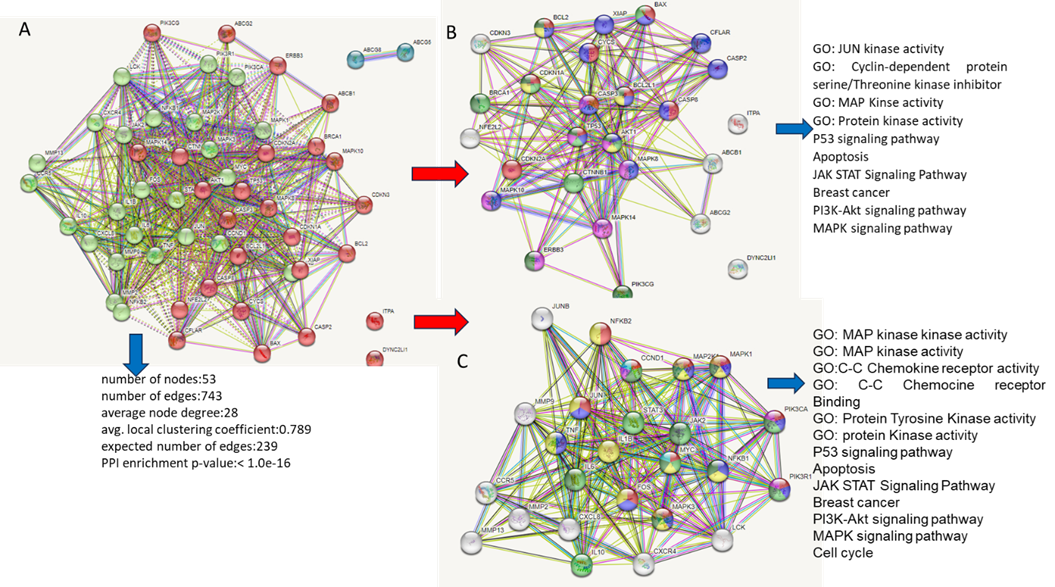In fig. 2C, Cluster 2 represents the PPI of target genes in cancer, which represents a different subset of target genes involved in processes related to breast cancer. This cluster consists of 25 nodes and 231 edges, indicating interactions between the proteins produced by these genes. Additionally, fig. 2C shows that compounds in Qustul Hindi are involved in the biological processes of breast cancer, including MAP kinase kinase activity, MAP kinase activity, C-C Chemokine receptor activity, C-C Chemokine receptor binding, Protein Tyrosine Kinase activity, and Protein Kinase activity.