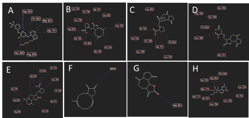 | Saussureamine A | -75.1218 | Thr 798, Ala 751, Leu 852, Leu 726, Asp 863, Gly 729, Val 734, Thr 862, Ser 783, Lys 753, Leu 796 | Asp 863, Ser 783, Thr 862 |