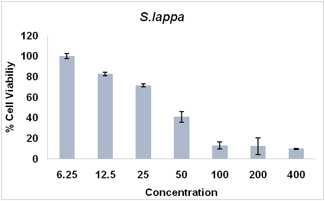 Fig. 5: Viability of T47D cells after treatment with qusthul hindi extract. For 24 h, T47D cells were treated with various concentrations of qusthul hindi extract, and cell viability was evaluated using the MTT assay. The cell viability profile is presented as the mean±standard deviation (SD) of three independent experiments.