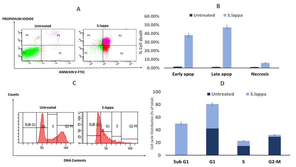 Overall, these findings indicate that Qusthul Hindi extract administration has effects on cell cycle and apoptosis in cancer cells. The extract may enhance cancer cell apoptosis (as seen from increased accumulation in the sub G1 phase) and inhibit cell proliferation (as seen from decreased accumulation in the G2-M and S phases). The increased number of cells in the G1 phase indicates a delay in the cell cycle and may lead to inhibition of cancer cell growth. However, further research is needed to understand the mechanism of action of Qusthul Hindi extract contributing to these findings and to clarify its potential use as a cancer therapy.