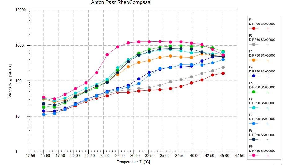 Gelation temperature was performed according to Repka et al. [19]. 1 ml aliquots of prepared formulations were transferred in a test tube, and the test tube was sealed with a parafilm and immersed in a water bath at 4 °C The temperature of the bath was increased in increments 1 °C and left to equilibrate for 15 min at each new temperature setting. The samples were examined for gelation, which is considered to have occurred when the meniscus would no longer move when tilted more than 90°; that temperature was considered the gelation temperature of the formulation. All the experiments were performed in triplicate. The rheological properties of the prepared formulations were determined using a spinning cone and plate rheometer MCR 102 (Anton Paar) with a diameter of 0.05m. The experiment was performed by maintaining a constant gap of 0.08 mm between geometry and Peltier. The graph of viscosity vs. temperature was plotted for all prepared formulations at different temperatures to determine the gelation temperature. A Peltier P-PTD 200 (Anton Paar) was used to regulate the temperature on the lower plate. An initial 1-2 min stabilization period was given to achieve constant temperature using a Peltier system to control the temperature. The sample was placed on the Peltier plate and analyzed at a temperature range of 15-45 °C [20].