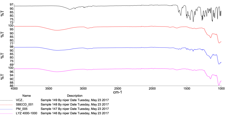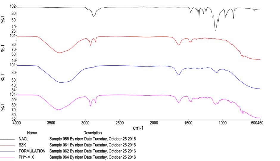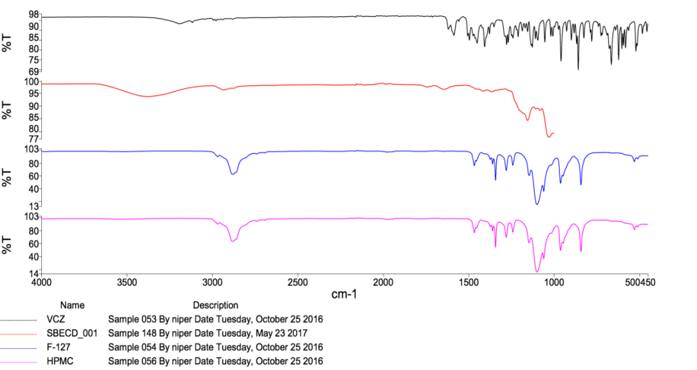 I. R. spectra of Voriconazole, SBECD, physical mixture (PM), and inclusion complex were noted on an I. R. spectrophotometer (Perkin-Elmer 1600, V-650 Jasco) in the range of 4000-400 cm−1 wavenumber to study interactions [14, 15].