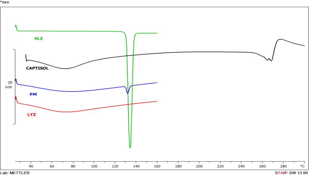 DSC analysis of Voriconazole, SBECD, PM, and inclusion complex was conducted (Mettler Toledo DSC 821). Dry nitrogen was pumped into the sample cell at 10 ml/min. Up to 10 mg samples were placed in pans with a pinhole and aluminium crimping, then scanned at 10 °C/min from 25-300 °C [16].