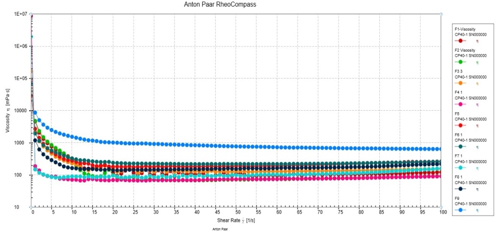 Rheological properties of the plain in-situ gel were determined using a spinning cone and plate rheometer MCR 102 (Anton Paar) with a 40 mm diameter. The experiment was performed by maintaining a constant gap of 0.08 mm between geometry and Peltier. The viscosity vs. shear rate graph was plotted for all in-situ gel formulations (F1 to F9). Peltier P-PTD 200 (Anton Paar) was installed at the lower plate to control the temperature. The sample was placed on the Peltier plate and analyzed at a shear rate of 0-100 rpm [21].
