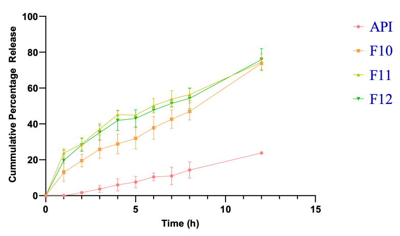 Fig. 9: In vitro drug release profile of plain drug, formulations F10, F11, and F12. Error bars indicate SD values of triplicate