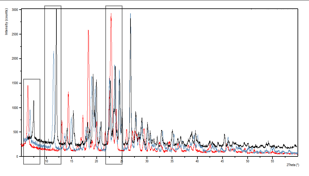 Fig. 1: XRD Diffractogram of standard ketoprofen (red), co-crystal formula 1 (blue) and co-crystal formula 2 (black)