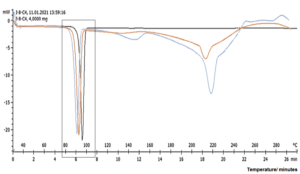 DSC thermal analysis testing provides an endothermic or exothermic peak result that indicates a change in the formation of medicinal crystals. Such changes include melting, evaporation, decomposition, or polymorphic transition [43]. The parameter measured by this instrument is the melting point and enthalpy energy from the co-crystal. In our study, thermal analysis using DSC was conducted by heating at 100 °C/minute at temperatures between 30 °C and 250 °C, which revealed a shifting temperature of the endothermic peak in standard Ketoprofen. The thermogram for the DSC analysis is shown in fig. 3.