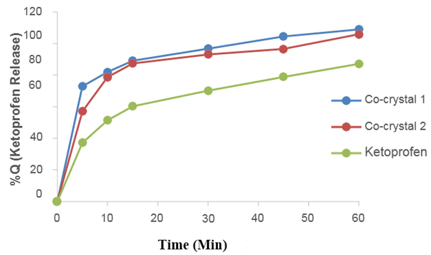 The dissolution profile showed a significant increase in the dissolution of Ketoprofen in the modified co-crystal compared to standard Ketoprofen. The dissolution results are presented in the table and fig. below. Based on the dissolution profile graph, it can be seen that co-crystal formula 1 has a larger area under the curve (AUC) value than co-crystal formula 2 and standard Ketoprofen. A more significant AUC value indicates that co-crystal formula 1 has a higher dissolution profile.