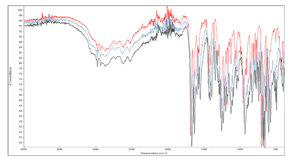 Fig. 2: FTIR spectrum ketoprofen (red), co-crystal formula 1 (blue) and co-crystal formula 2 (black)