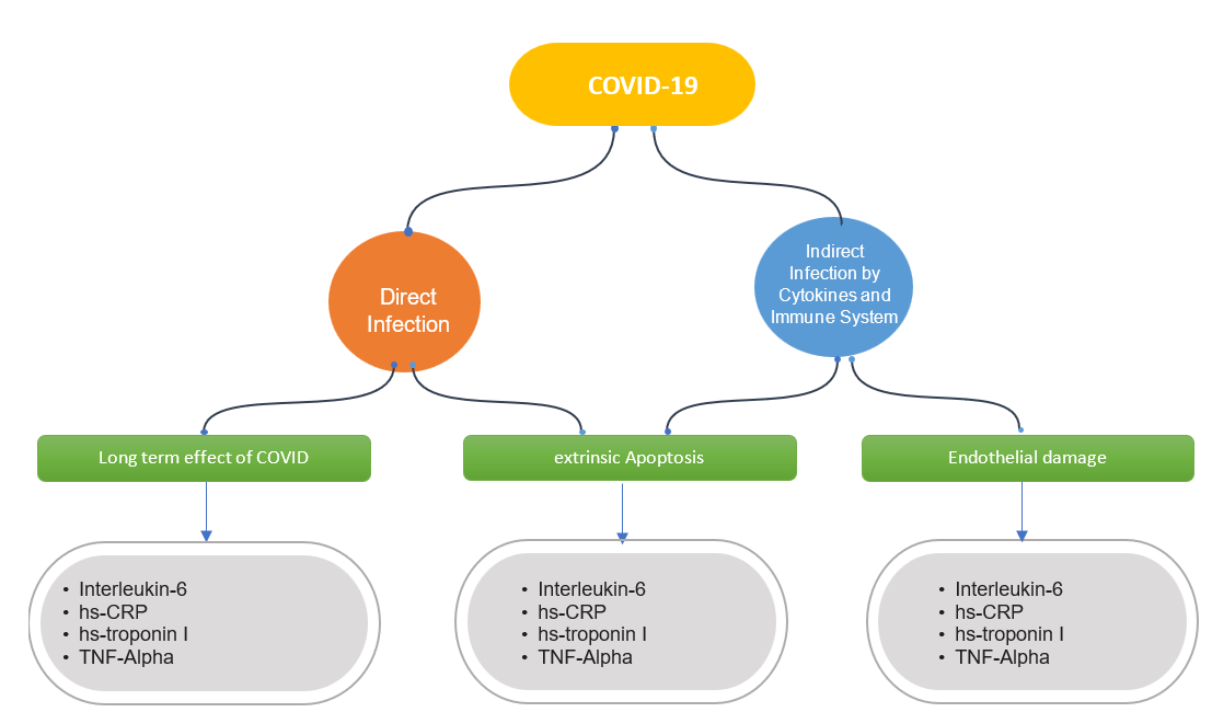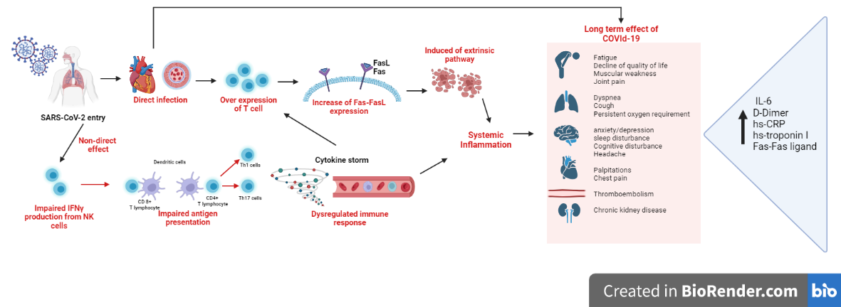 The pathogenesis of SARS-CoV-2 infection can be divided in 2 ways: direct damage to organs and indirect damage caused by cytokine storm. This infection can cause lasting effects even after the patient has tested negative, which is called as long-term effect of COVID-19. One of these long-term effects is endothelial damage caused by direct endothelial cell infection and increasing endothelial cell apoptosis infection due to a cytokine storm. Cytokine storm increases the expression of Fas and Fas ligand; these proteins play a role in the mechanism of extrinsic apoptosis. This causes damage to the endothelial cells, leading to cardiovascular disease. This endothelial damage can be identified by increasing several blood markers such as interleukin-6, high sensitivity C-reactive protein, hs-troponin I, and tumor necrosis factor-alpha (fig. 5).