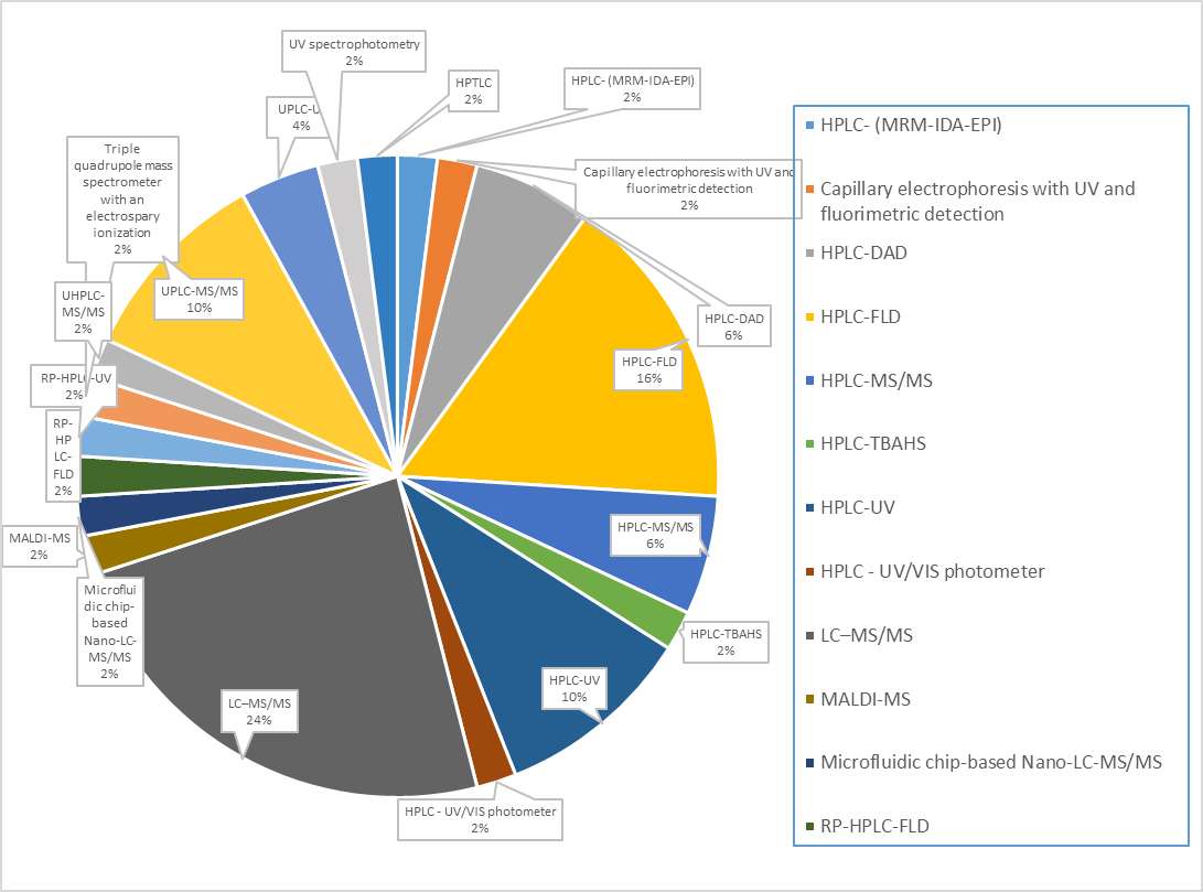 This article reviews several HPLC methods, including HPLC-UV, HPLC-FLD, HPLC-DAD, HPLC-MS-MS, and HPLC-TBAHS; UPLC methods, including UPLC-MS-MS and UPLC-UV; RP-HPLC methods, including RP-HPLC-FLD and RP-HPLC-UV; LC-MS-MS methods, including microfluidic chip-based Nano-LC-MS-MS and LC-MS-MS, MALDI-MS-MS method, capillary electrophoresis with UV and fluorometric detection, and Triple quadrupole mass spectrometer with electrospray ionization methods. Also reviews the simple sample preparation techniques such as solid-phase extraction, liquid-liquid extractions, and protein precipitation, various columns and mobile phase, the retention time of each method, and linearity range of the various methods.