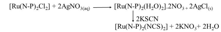 [Ru(N-P)2Cl2] was prepared using literature methods [7]. In brief, a [Ru(N-P)2Cl2] suspension (0.4 g, 0.5 mmol) in acetone (40 ml) was added to a filtered silver nitrate solution (0.17 g, 1.0 mmol) in distilled water (10 ml). Refluxing and stirring under nitrogen gas took two hours. A white AgCl precipitate formed, turning the solution yellow. A sintered-glass crucible cooled and filtered the mixture. The filtered solution contained 10 ml of potassium thiocyanate (0.10 g, 1.0 mmol) in acetone. The yellow solution turns orange. After extracting half the solvent under reduced pressure, 20 ml of diethyl ether precipitated the product. The orange complex was filtered, washed with 210 ml of distilled water and diethyl ether, and vacuum-dried at 60 °C. Yield: 0.31 g (74%), m. p. 205-210 °C (scheme 1) [8].