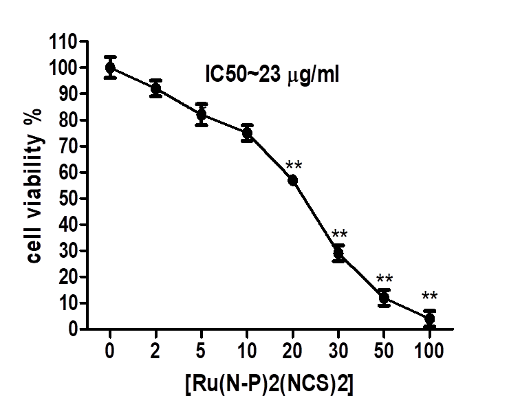 Using the trypan blue exclusion assay for cell viability, the cytotoxic effects of [Ru(N-P)2(NCS)2 were quantified. The cytotoxicity of [Ru(N-P)2(NCS)2] differed significantly from that of the control (P ˂ 0.001). The estimated IC50 for [Ru(N-P)2(NCS)2] is 23 g/ml (fig. 3).