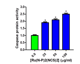 Caspase3 activity—the apoptotic process's executioner—was measured to determine [Ru(N-P)2(NCS)2's cytotoxicity mechanism. Ru(N-P)2(NCS)2 activates Caspase 3 (P˂0.05), suggesting caspase-independent programmed cell death. [Ru(N-P)2(NCS)2] dose-dependently induced caspase-3 (fig. 4).