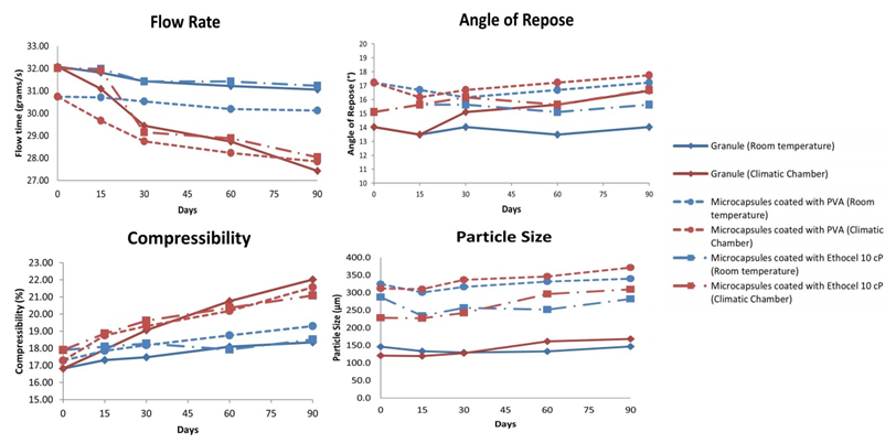 The flow rate of granules, microcapsules coated with polyvinyl alcohol, and Ethocel 10 cP under storage conditions in a climate chamber decreased. This affected the increase in the value of the angle of repose of granules and microcapsules, which were coated with polyvinyl alcohol and Ethocel 10 cP (fig. 3).